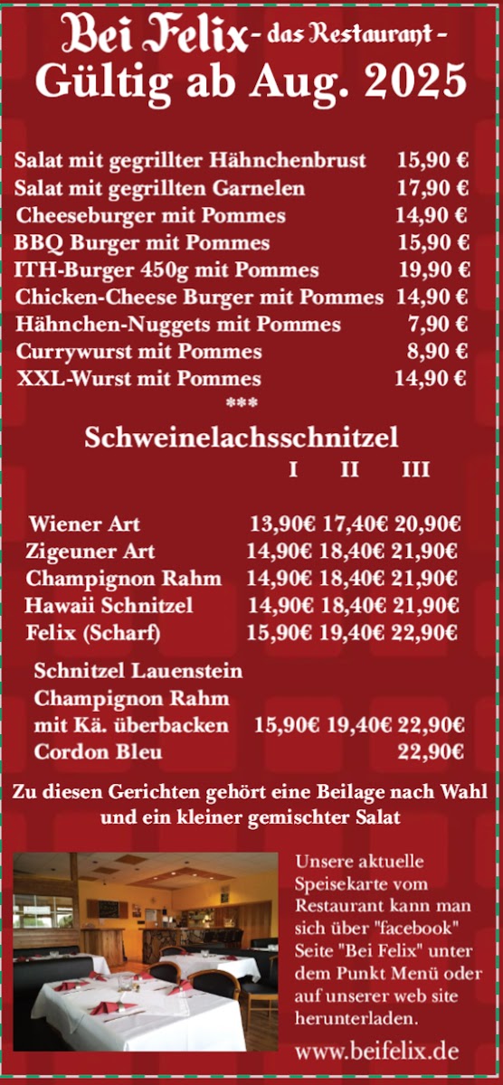 Bei Felix in Salzhemmendorf invites guests to indulge in a varied menu that centers around hearty, traditional German comfort food. The highlight is undoubtedly the Schnitzelbuffet, praised for its fresh, flavorful selection of pork and chicken schnitzels served with an array of rich sauces and fresh salads. Customers consistently appreciate the generous portions and the attentive, friendly service that ensures dishes are promptly refilled, maintaining a vibrant and satisfying dining experience.